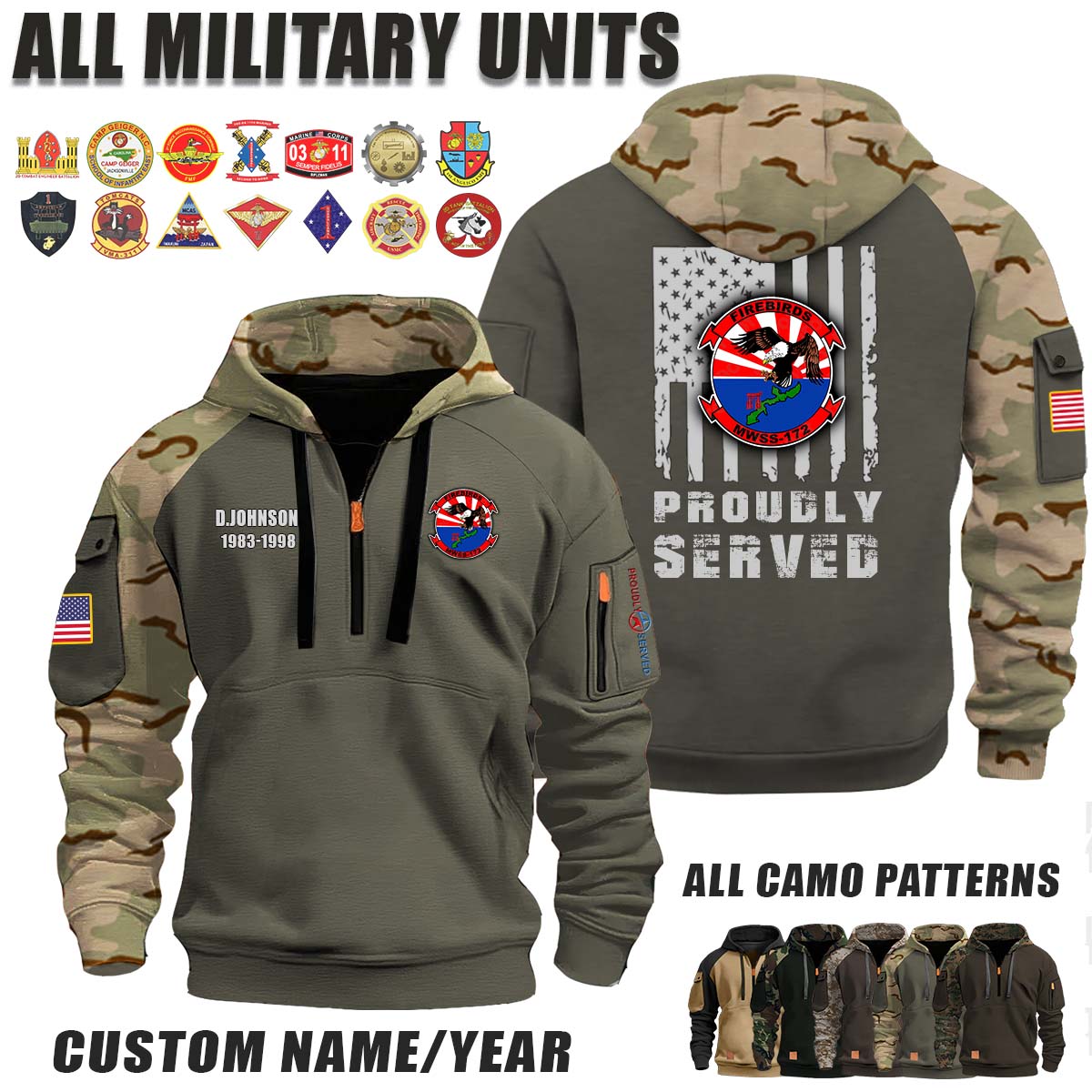 This MWSS-172 Firebirds_Camo Halfzip Hoodie lets you customize your Branch, Unit, Role, Rank, and Years Served — so your service, sacrifice, and pride live on.