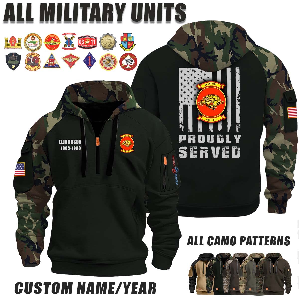 This MWSS-273 Sweathogs_Camo Halfzip Hoodie lets you customize your Branch, Unit, Role, Rank, and Years Served — so your service, sacrifice, and pride live on.
