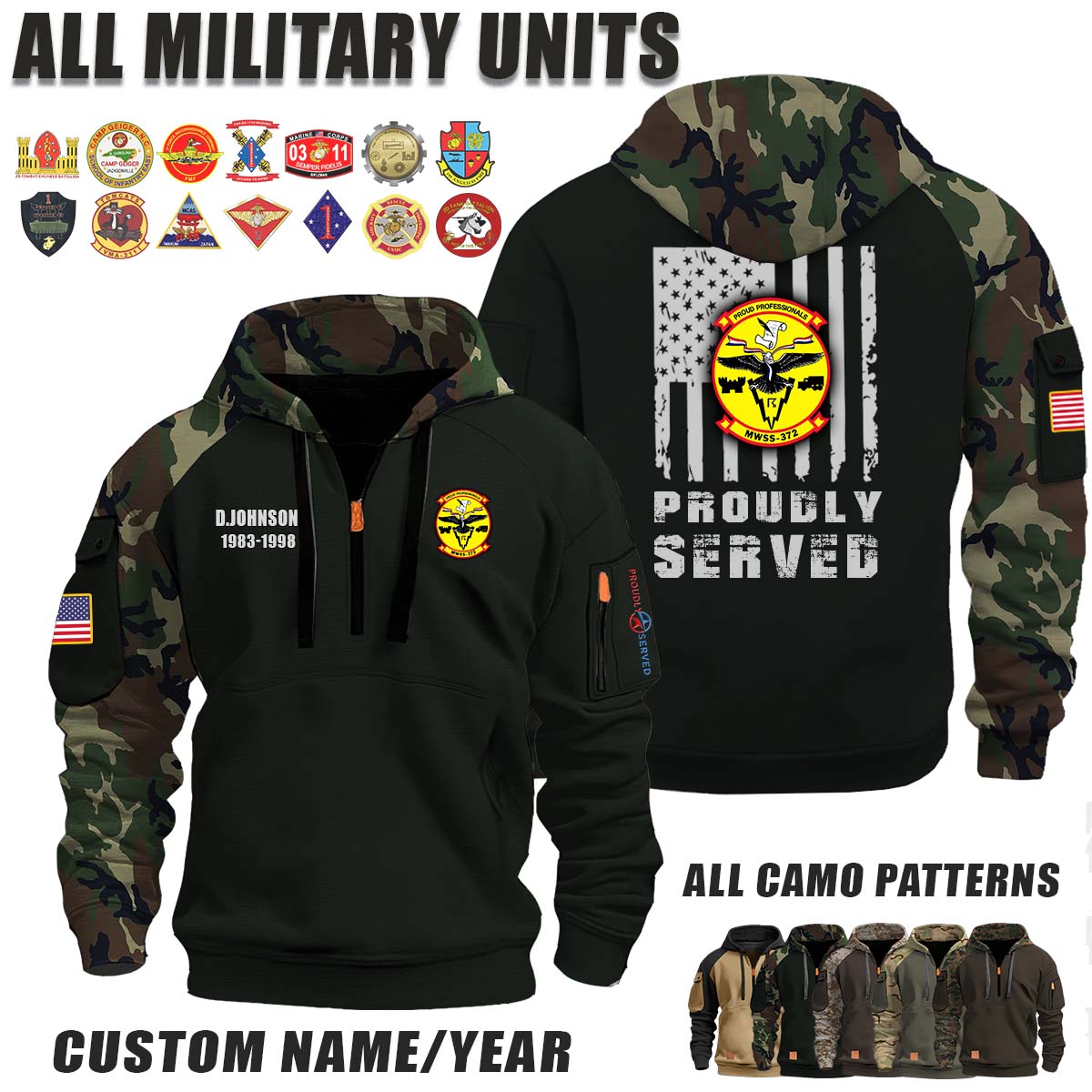 This MWSS-372 Marine Wing Support Squadron 372_Camo Halfzip Hoodie lets you customize your Branch, Unit, Role, Rank, and Years Served — so your service, sacrifice, and pride live on.