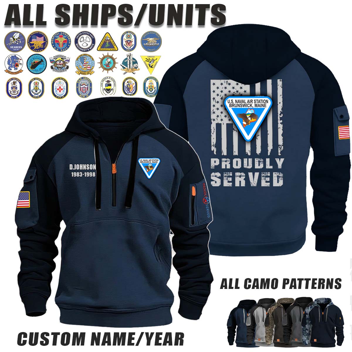 This NAS Naval Air Station Brunswick_Camo Halfzip Hoodie lets you customize your Branch, Unit, Role, Rank, and Years Served — so your service, sacrifice, and pride live on.