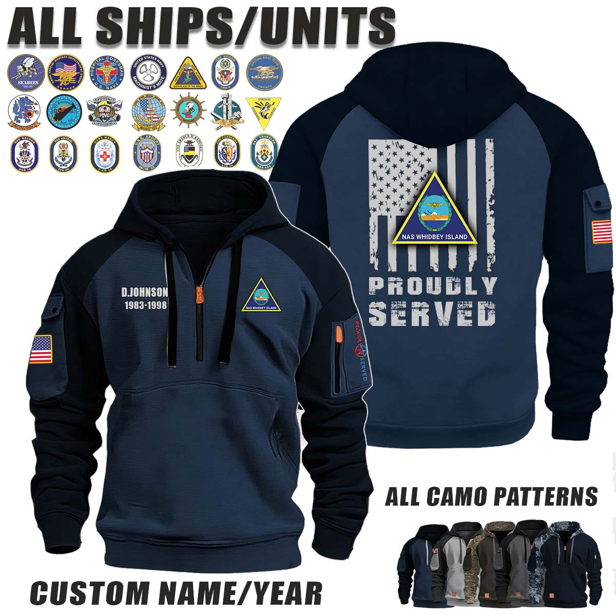 This NASWI Naval Air Station Whidbey Island_Camo Halfzip Hoodie lets you customize your Branch, Unit, Role, Rank, and Years Served — so your service, sacrifice, and pride live on.