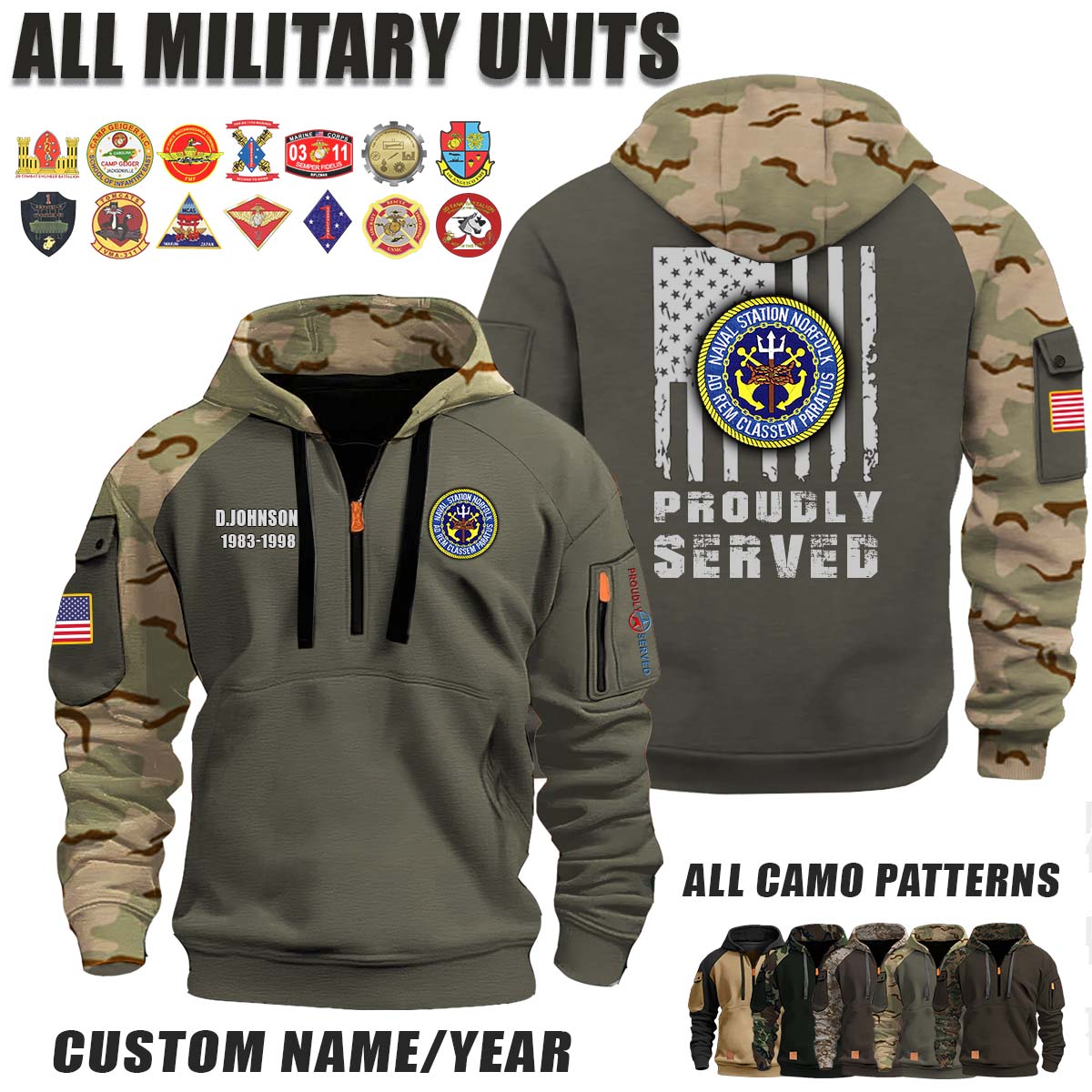 This Naval Station Norfolk_Camo Halfzip Hoodie lets you customize your Branch, Unit, Role, Rank, and Years Served — so your service, sacrifice, and pride live on.