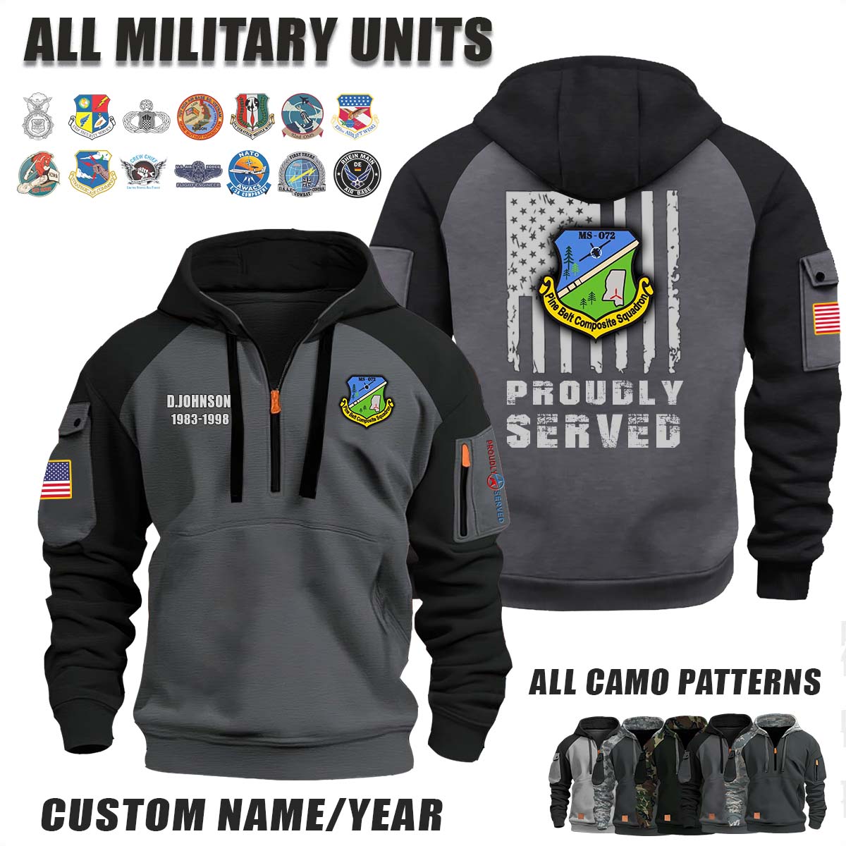 This Pinebelt Composite Squadron MS-072_Camo Halfzip Hoodie lets you customize your Branch, Unit, Role, Rank, and Years Served — so your service, sacrifice, and pride live on.
