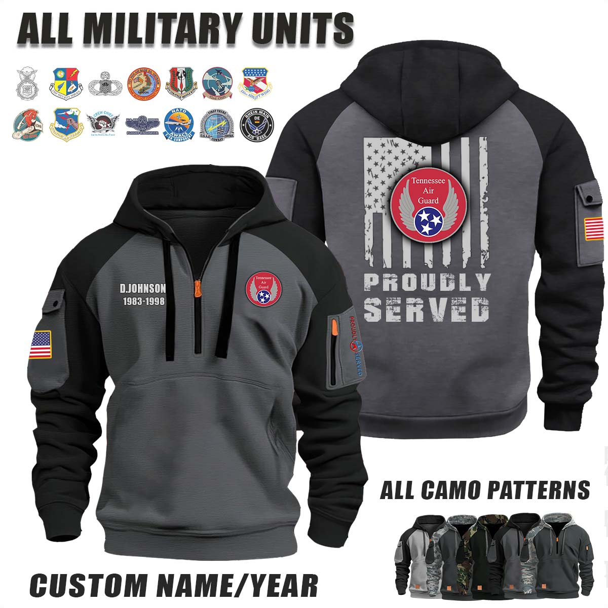 This TN ANG Tennessee Air National Guard_Camo Halfzip Hoodie lets you customize your Branch, Unit, Role, Rank, and Years Served — so your service, sacrifice, and pride live on.