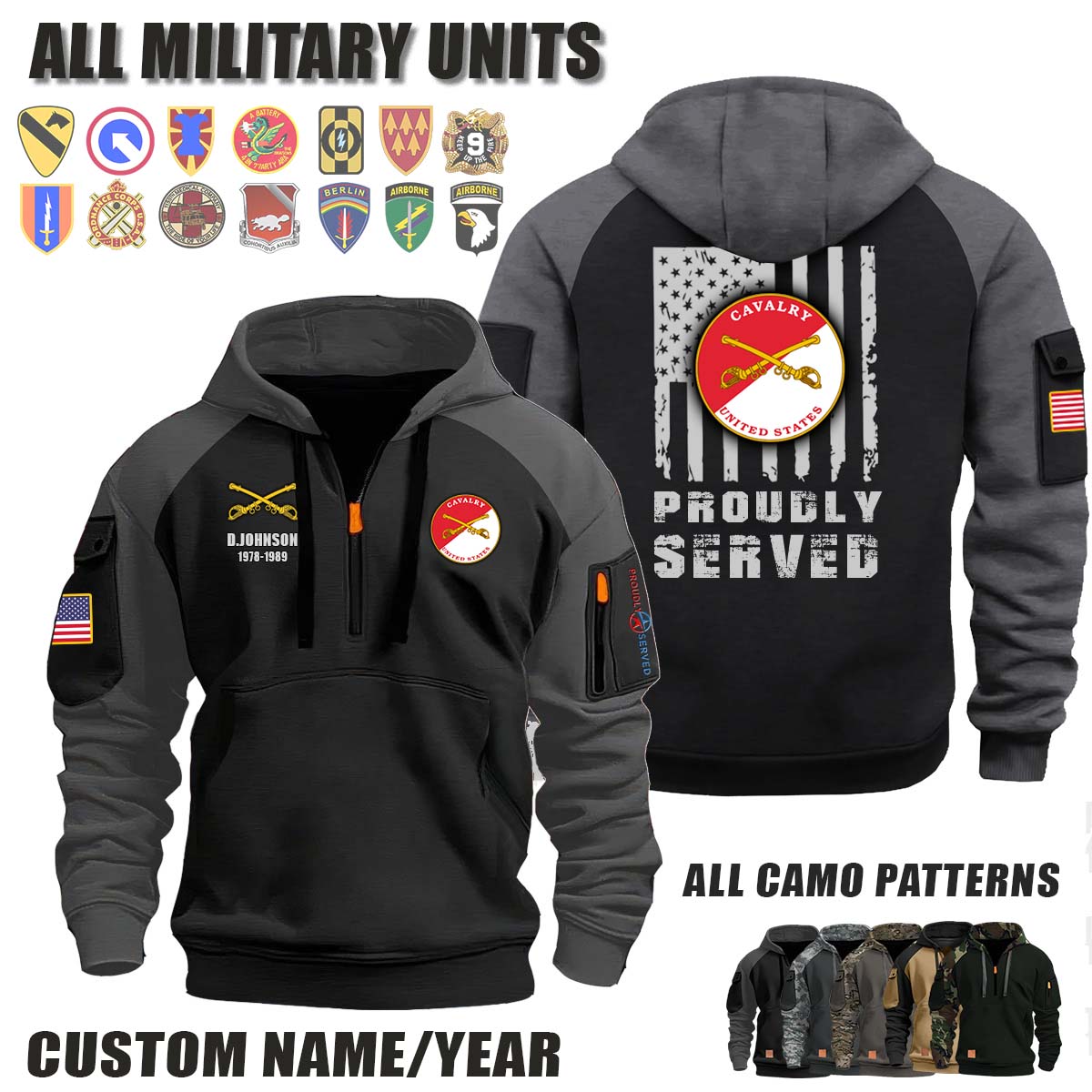 This United States Cavalry US Cavalry_Camo Halfzip Hoodie lets you customize your Branch, Unit, Role, Rank, and Years Served — so your service, sacrifice, and pride live on.