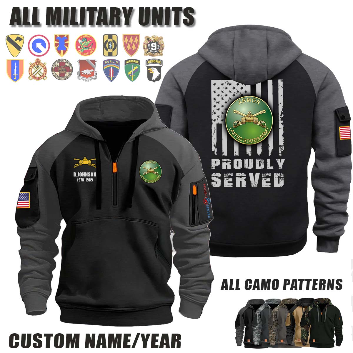 This US Army Armor_Camo Halfzip Hoodie lets you customize your Branch, Unit, Role, Rank, and Years Served — so your service, sacrifice, and pride live on.