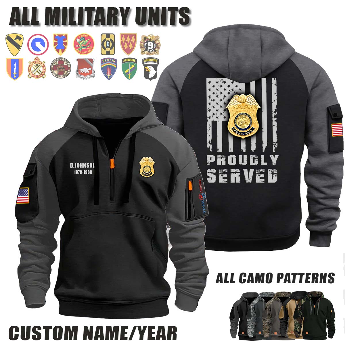This US Army Criminal Investigation Division_Camo Halfzip Hoodie lets you customize your Branch, Unit, Role, Rank, and Years Served — so your service, sacrifice, and pride live on.