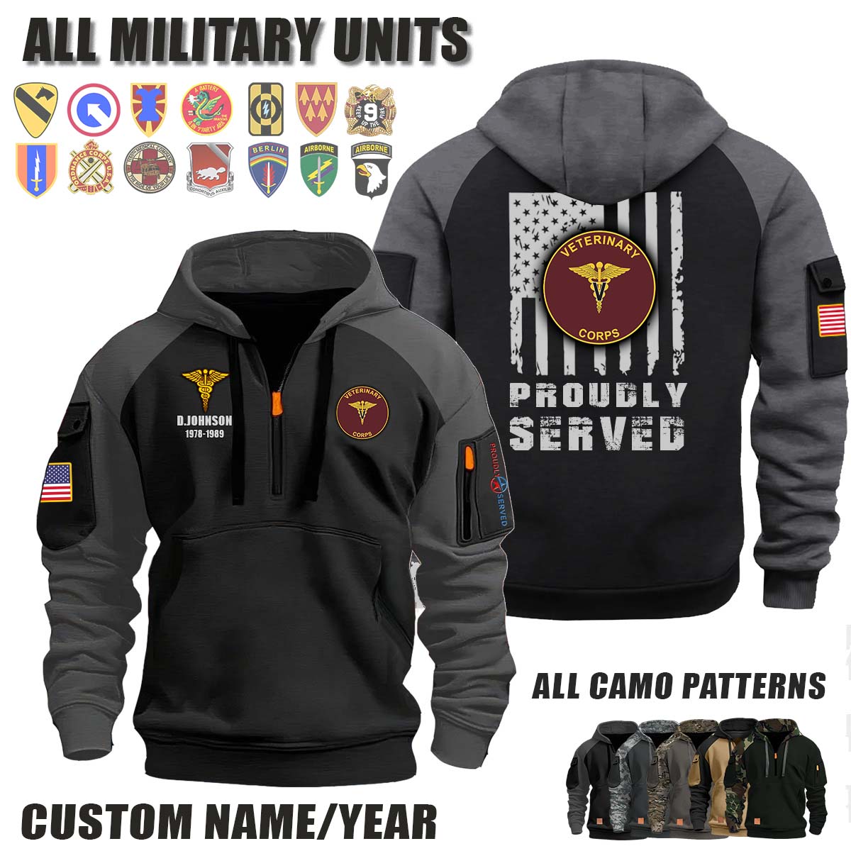 This _US Army Veterinary Corps_Camo Halfzip Hoodie lets you customize your Branch, Unit, Role, Rank, and Years Served — so your service, sacrifice, and pride live on.