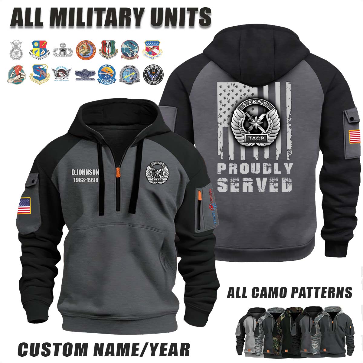 This USAF Tactical Air Control Party (TACP)_Camo Halfzip Hoodie lets you customize your Branch, Unit, Role, Rank, and Years Served — so your service, sacrifice, and pride live on.