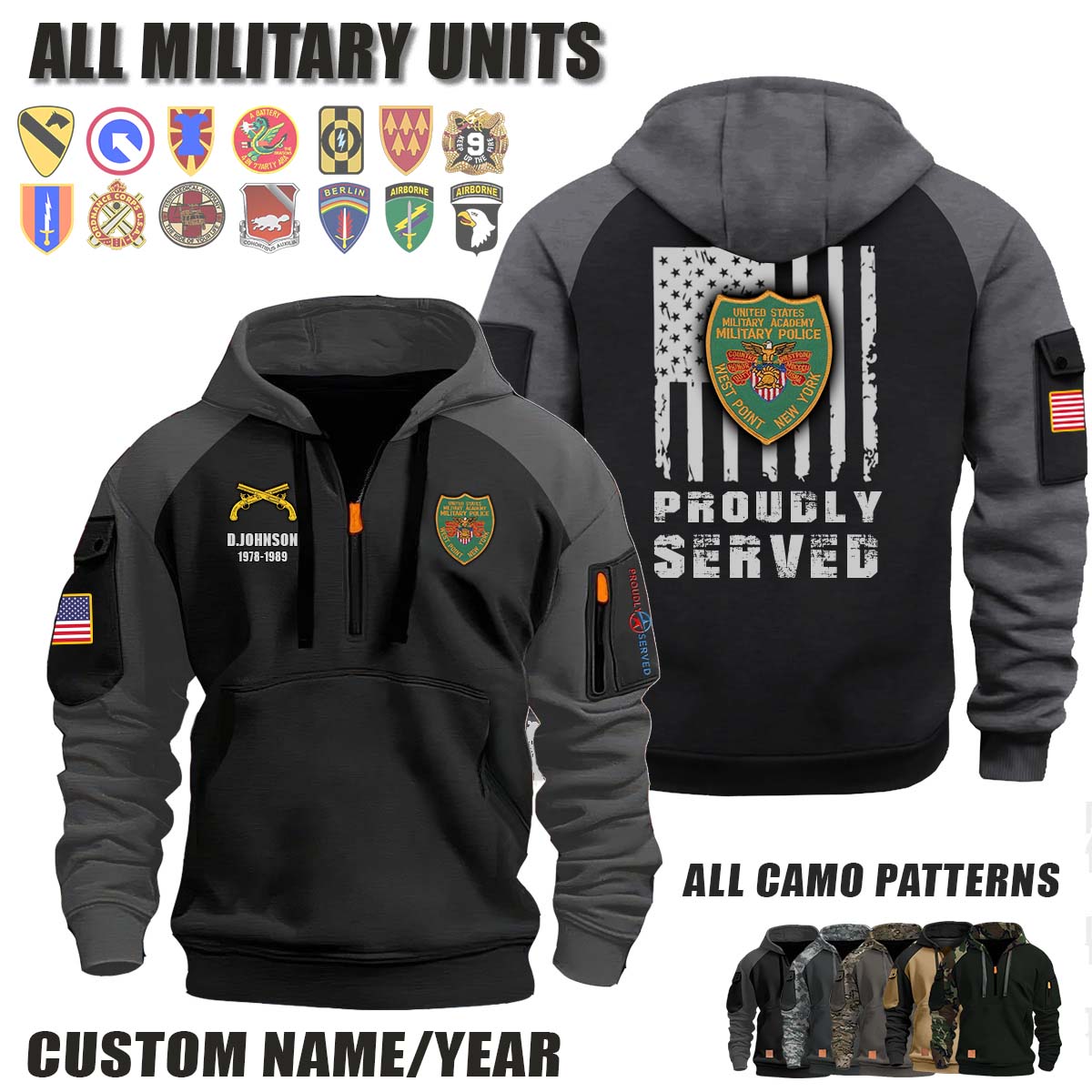 This USMA Military Police West Point_Camo Halfzip Hoodie lets you customize your Branch, Unit, Role, Rank, and Years Served — so your service, sacrifice, and pride live on.