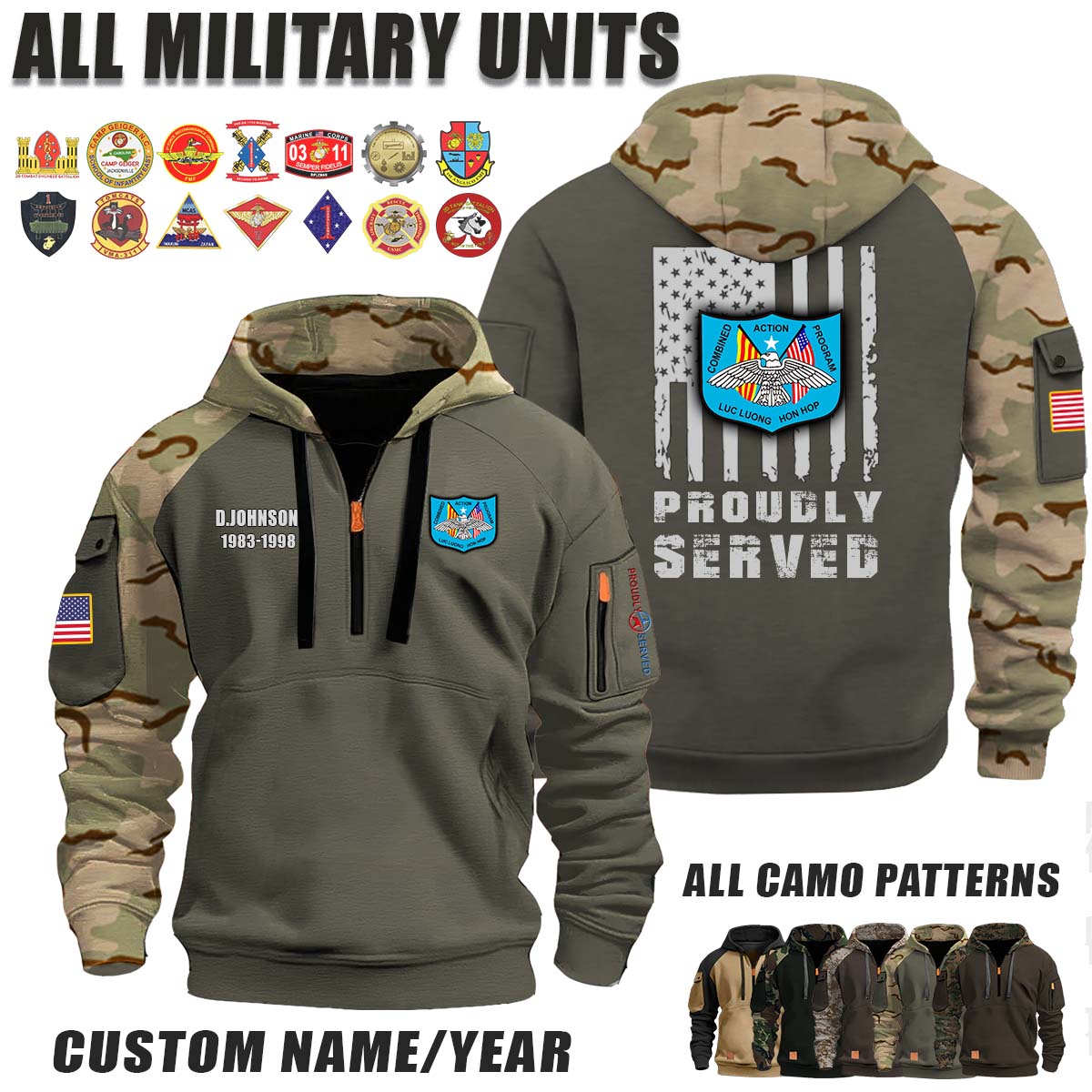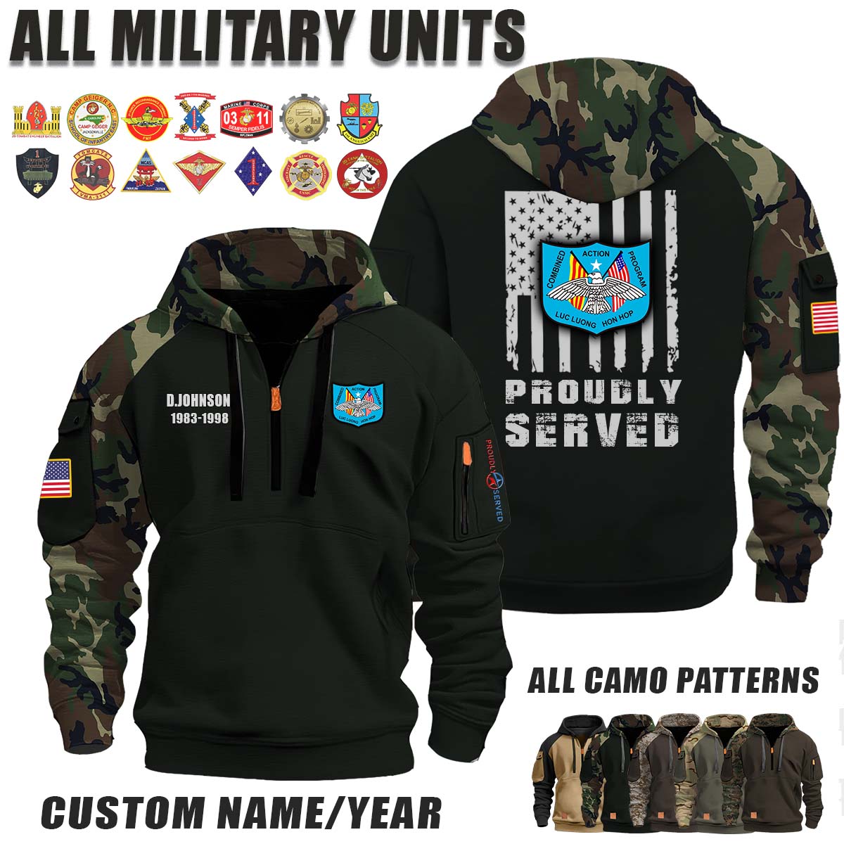 This USMC CAP Combined Action Program_Camo Halfzip Hoodie lets you customize your Branch, Unit, Role, Rank, and Years Served — so your service, sacrifice, and pride live on.