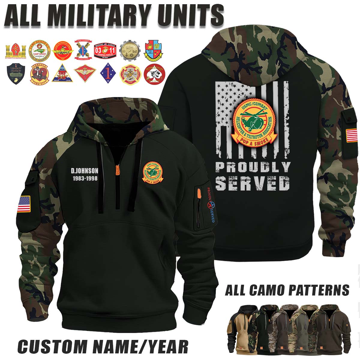 This USMC Combat Helicopter & Tiltrotor Association Pop A Smoke_Camo Halfzip Hoodie lets you customize your Branch, Unit, Role, Rank, and Years Served — so your service, sacrifice, and pride live on.