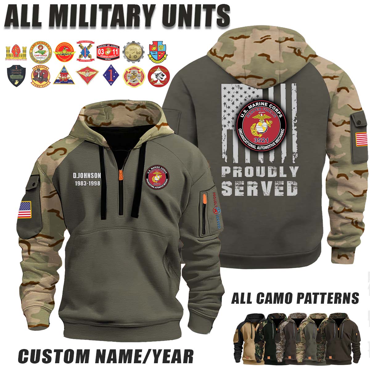 This USMC MOS 3521 Marine Corps Mechanics_Camo Halfzip Hoodie lets you customize your Branch, Unit, Role, Rank, and Years Served — so your service, sacrifice, and pride live on.