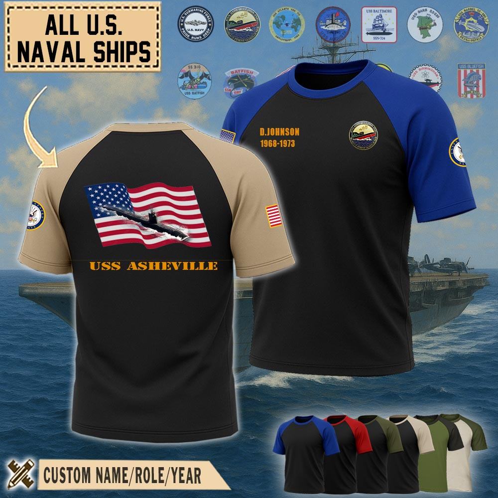 Show your pride with our USS Asheville (SSN-758)_Raglan Tshirt honoring the service, sacrifice, and contributions. Wear the emblem with pride, symbolizing the unwavering dedication and integrity of the men and women who serve in this distinguished force.