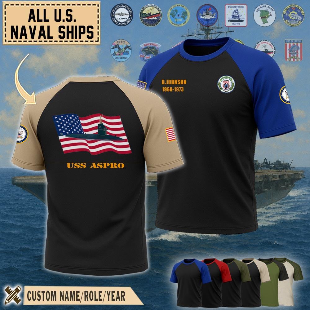 Show your pride with our USS Aspro (SSN-648)_Raglan Tshirt honoring the service, sacrifice, and contributions. Wear the emblem with pride, symbolizing the unwavering dedication and integrity of the men and women who serve in this distinguished force.