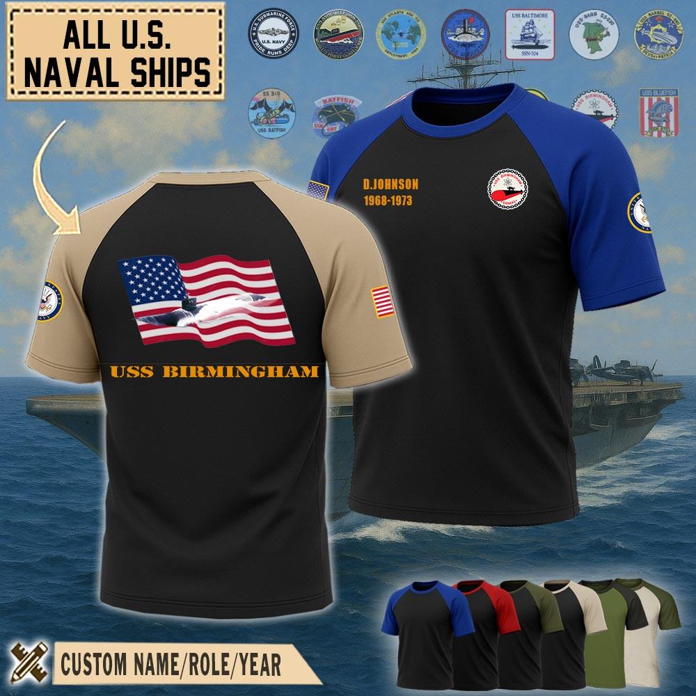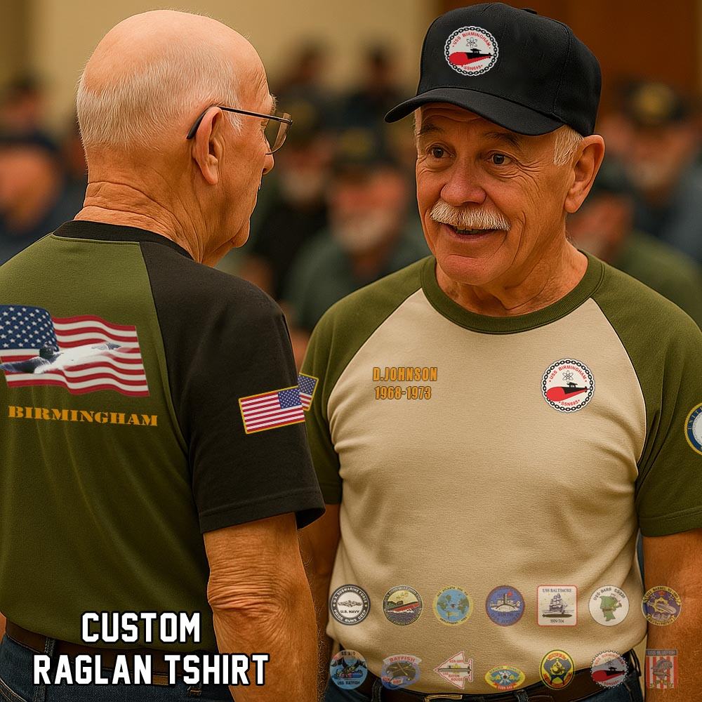 Show your pride with our USS Birmingham (SSN-695)_Raglan Tshirt honoring the service, sacrifice, and contributions. Wear the emblem with pride, symbolizing the unwavering dedication and integrity of the men and women who serve in this distinguished force.