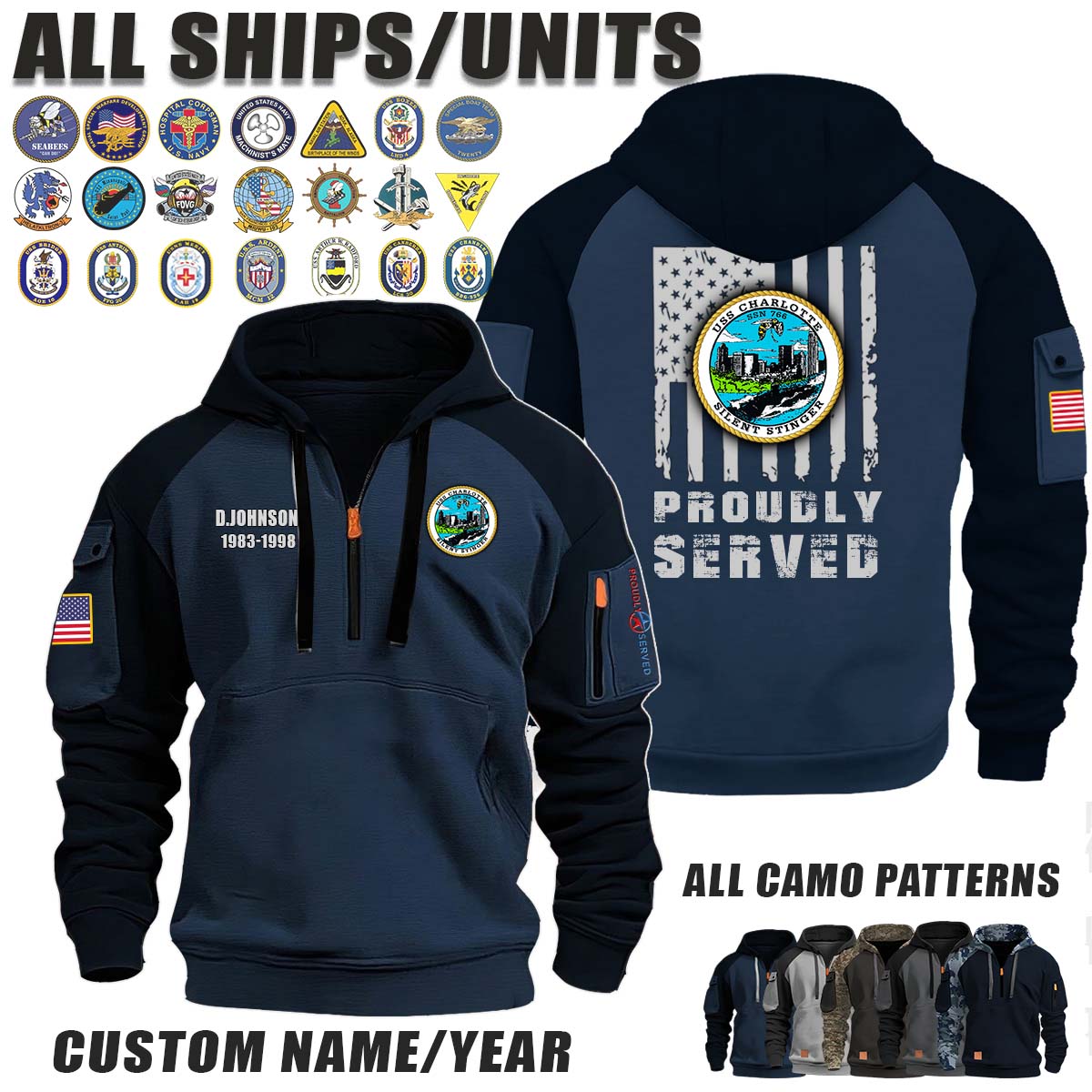 This USS Charlotte (SSN-766)_Camo Halfzip Hoodie lets you customize your Branch, Unit, Role, Rank, and Years Served — so your service, sacrifice, and pride live on.
