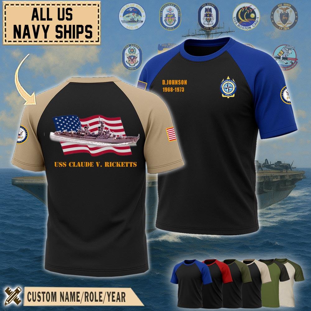 Show your pride with our USS Claude V. Ricketts (DDG-5)_Raglan Tshirt honoring the service, sacrifice, and contributions. Wear the emblem with pride, symbolizing the unwavering dedication and integrity of the men and women who serve in this distinguished force.
