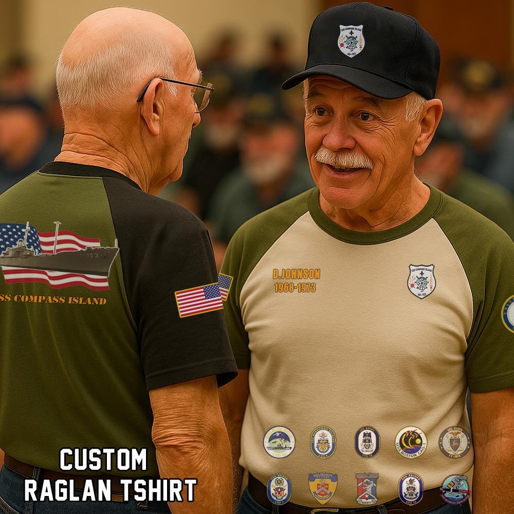 Show your pride with our USS Compass Island AG-153_Raglan Tshirt honoring the service, sacrifice, and contributions. Wear the emblem with pride, symbolizing the unwavering dedication and integrity of the men and women who serve in this distinguished force.