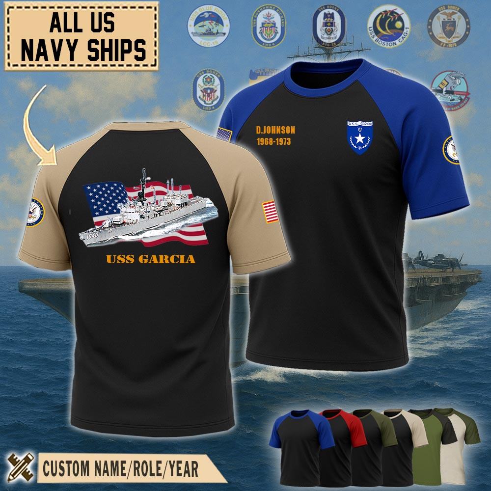 Show your pride with our USS Garcia (FF-1040)_Raglan Tshirt honoring the service, sacrifice, and contributions. Wear the emblem with pride, symbolizing the unwavering dedication and integrity of the men and women who serve in this distinguished force.