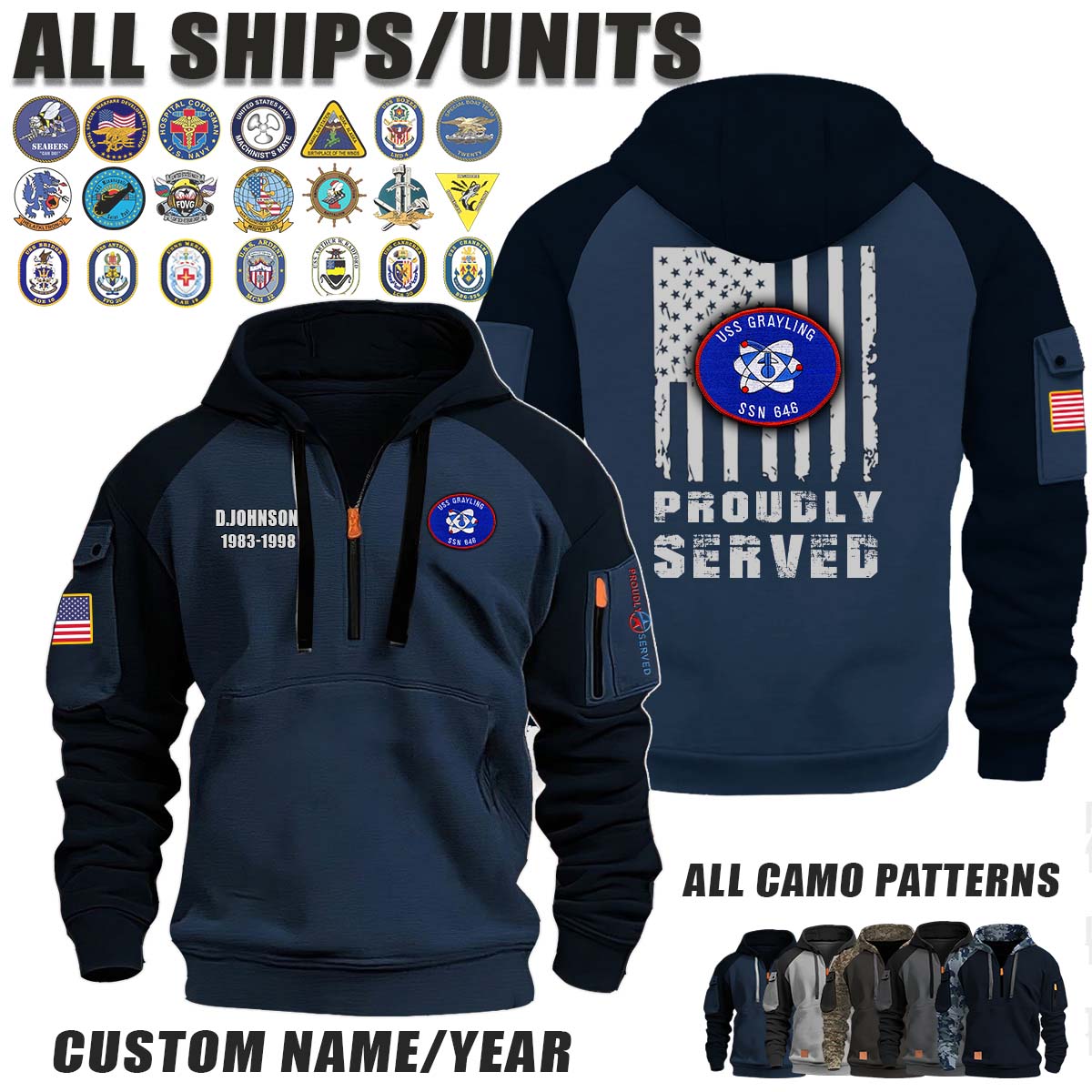 This USS Grayling (SSN-646)_Camo Halfzip Hoodie lets you customize your Branch, Unit, Role, Rank, and Years Served — so your service, sacrifice, and pride live on.
