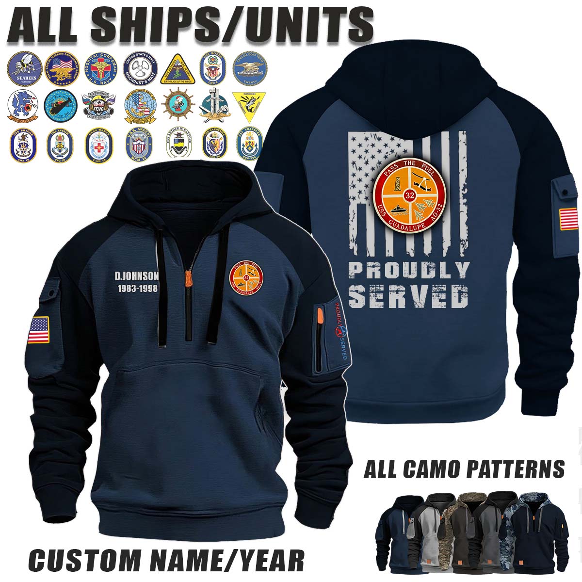 This USS Guadalupe (AO-32)_Camo Halfzip Hoodie lets you customize your Branch, Unit, Role, Rank, and Years Served — so your service, sacrifice, and pride live on.