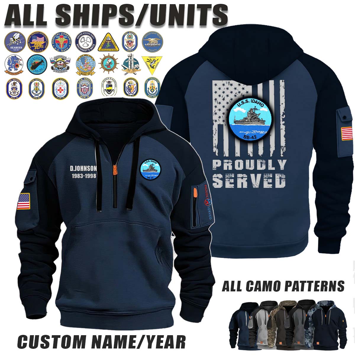 This USS Idaho (BB-42)_Camo Halfzip Hoodie lets you customize your Branch, Unit, Role, Rank, and Years Served — so your service, sacrifice, and pride live on.