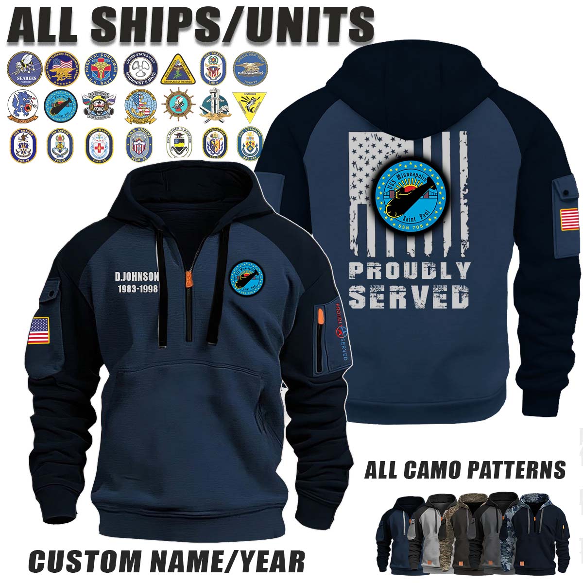 This USS Minneapolis–Saint Paul (SSN-708)_Camo Halfzip Hoodie lets you customize your Branch, Unit, Role, Rank, and Years Served — so your service, sacrifice, and pride live on.