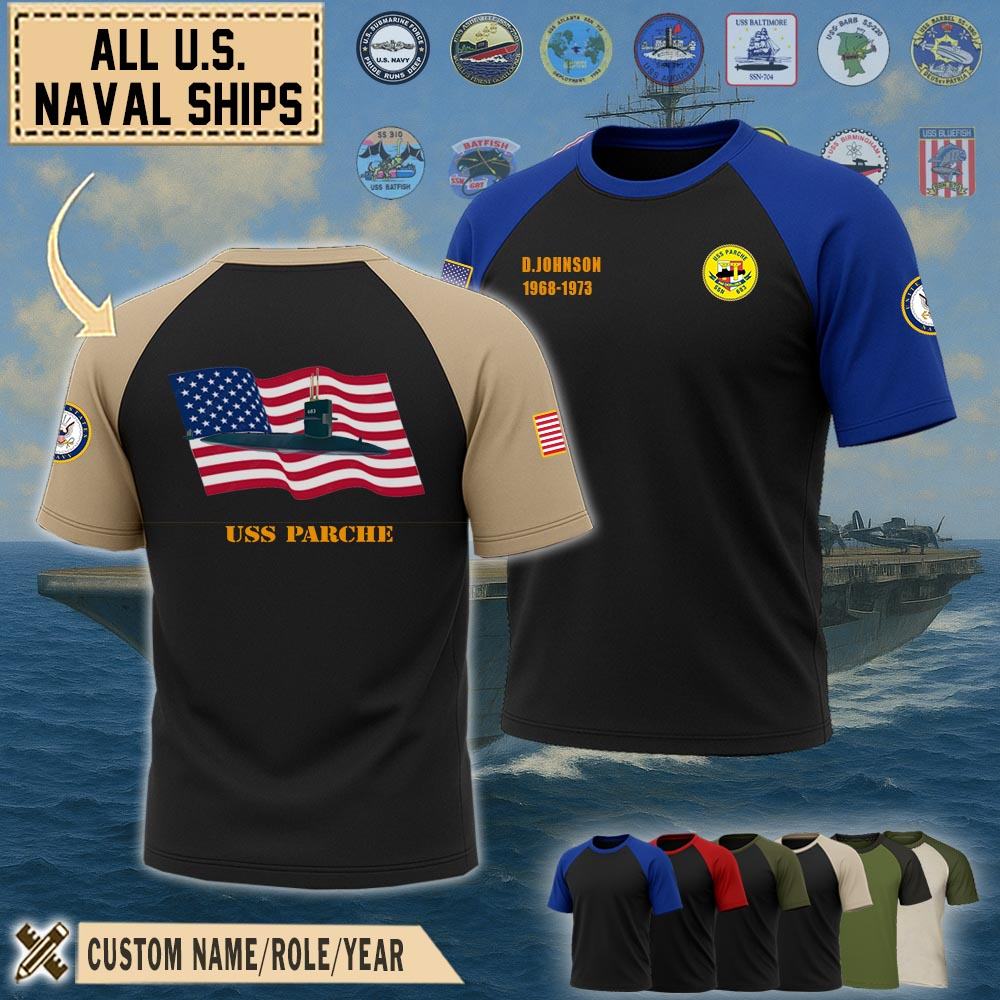 Show your pride with our USS Parche (SSN-683)_Raglan Tshirt honoring the service, sacrifice, and contributions. Wear the emblem with pride, symbolizing the unwavering dedication and integrity of the men and women who serve in this distinguished force.