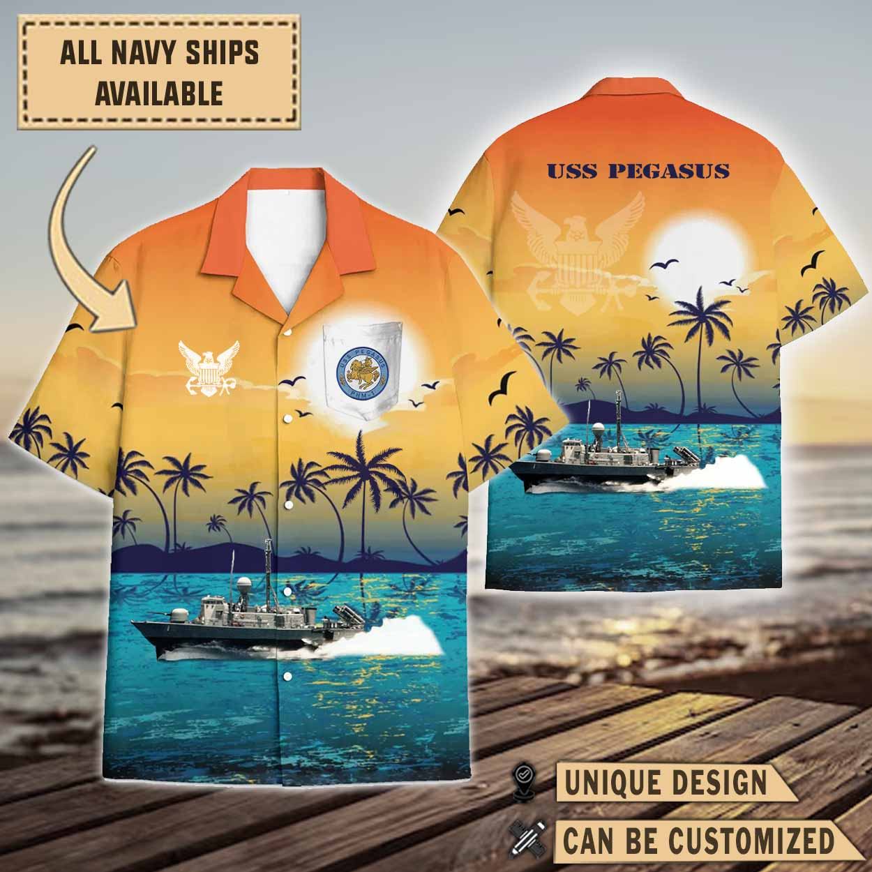Show your pride with our USS Pegasus (PHM-1)_Sunset Hawaiian Shirt honoring the service, sacrifice, and contributions. Wear the emblem with pride, symbolizing the unwavering dedication and integrity of the men and women who serve in this distinguished force.