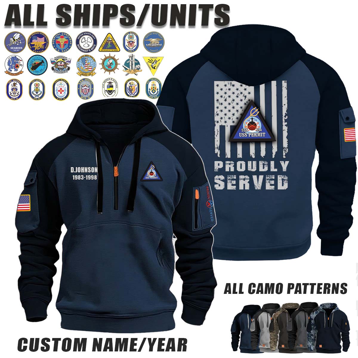 This USS Permit (SSN-594)_Camo Halfzip Hoodie lets you customize your Branch, Unit, Role, Rank, and Years Served — so your service, sacrifice, and pride live on.