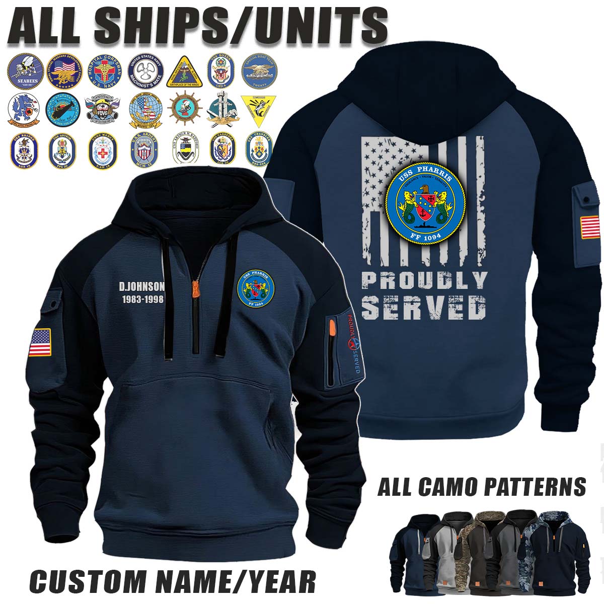 This USS Pharris (FF-1094)_Camo Halfzip Hoodie lets you customize your Branch, Unit, Role, Rank, and Years Served — so your service, sacrifice, and pride live on.