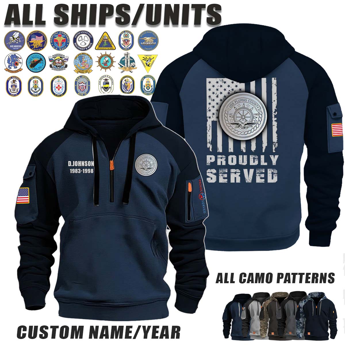 This USS Plumas County (LST-1083)_Camo Halfzip Hoodie lets you customize your Branch, Unit, Role, Rank, and Years Served — so your service, sacrifice, and pride live on.