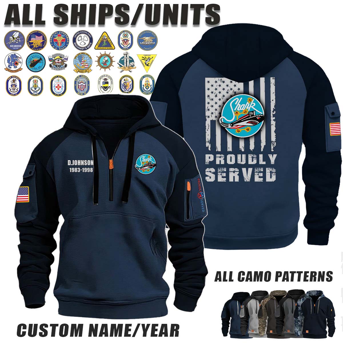 This USS SHARK (SSN-591)_Camo Halfzip Hoodie lets you customize your Branch, Unit, Role, Rank, and Years Served — so your service, sacrifice, and pride live on.