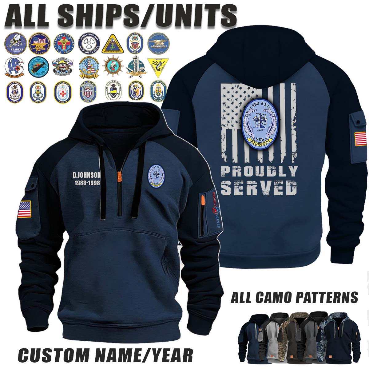 This USS STURGEON (SSN-637)_Camo Halfzip Hoodie lets you customize your Branch, Unit, Role, Rank, and Years Served — so your service, sacrifice, and pride live on.