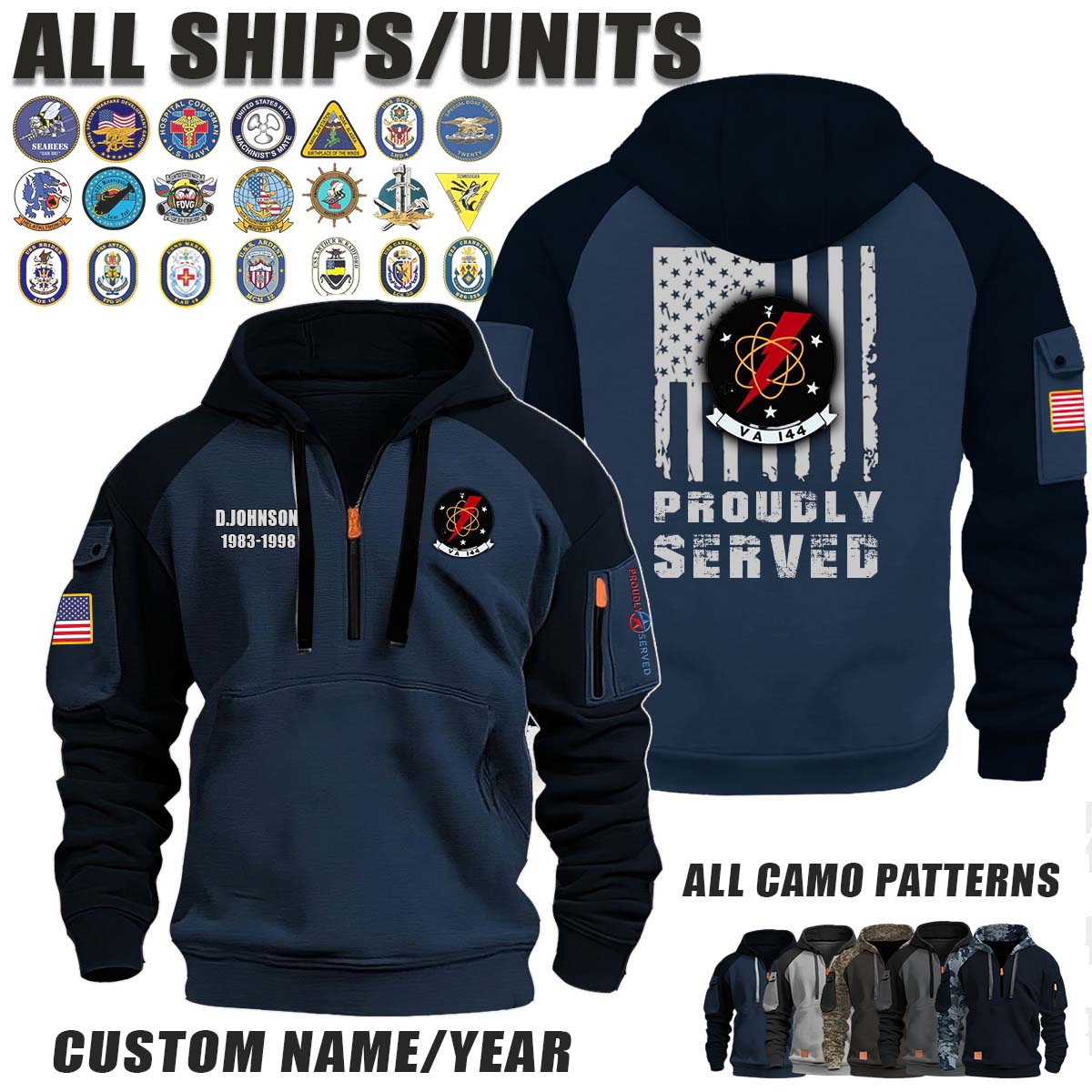This VA-144 Roadrunners_Camo Halfzip Hoodie lets you customize your Branch, Unit, Role, Rank, and Years Served — so your service, sacrifice, and pride live on.