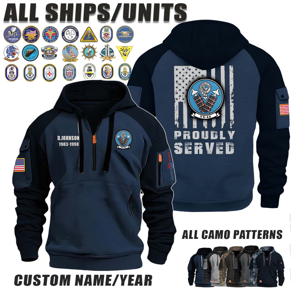 This VA-46 Clansmen_Camo Halfzip Hoodie lets you customize your Branch, Unit, Role, Rank, and Years Served — so your service, sacrifice, and pride live on.