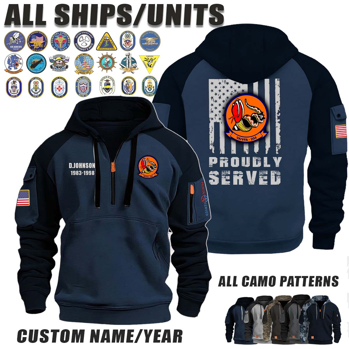 This VA VFA-204 River Rattlers_Camo Halfzip Hoodie lets you customize your Branch, Unit, Role, Rank, and Years Served — so your service, sacrifice, and pride live on.