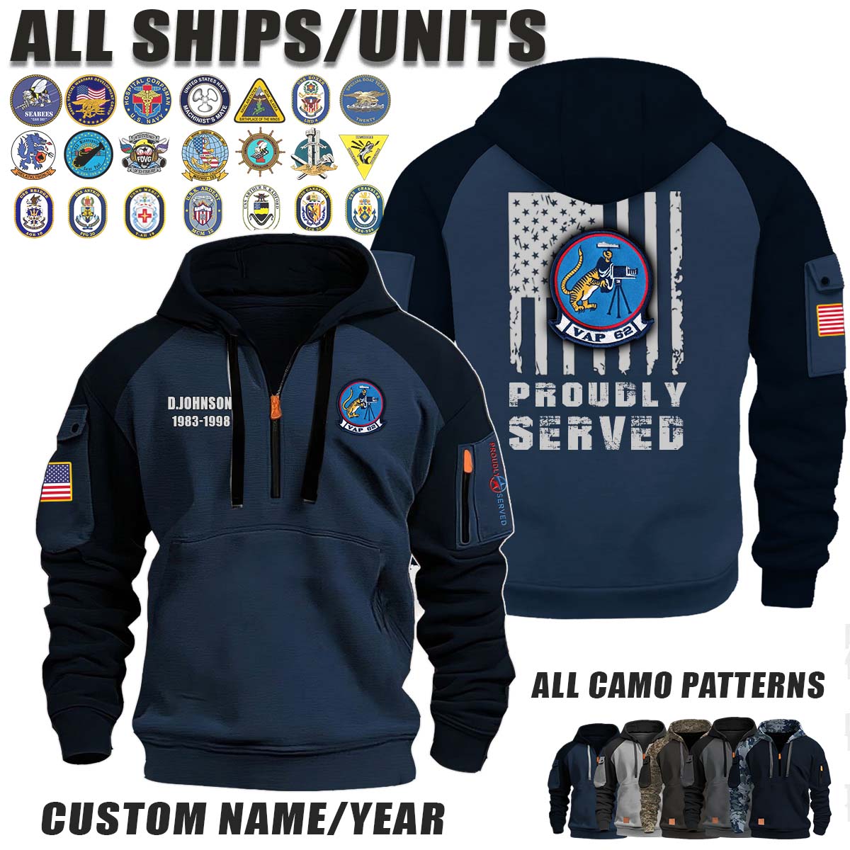 This VAP-62 Tigers_Camo Halfzip Hoodie lets you customize your Branch, Unit, Role, Rank, and Years Served — so your service, sacrifice, and pride live on.
