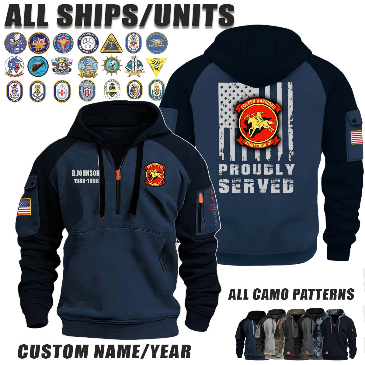 This VFA-87 Golden Warriors_Camo Halfzip Hoodie lets you customize your Branch, Unit, Role, Rank, and Years Served — so your service, sacrifice, and pride live on.