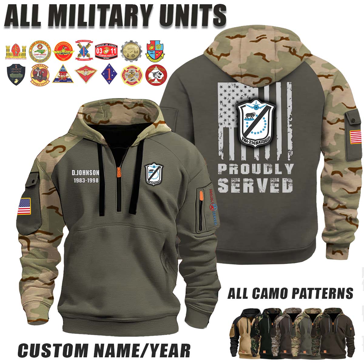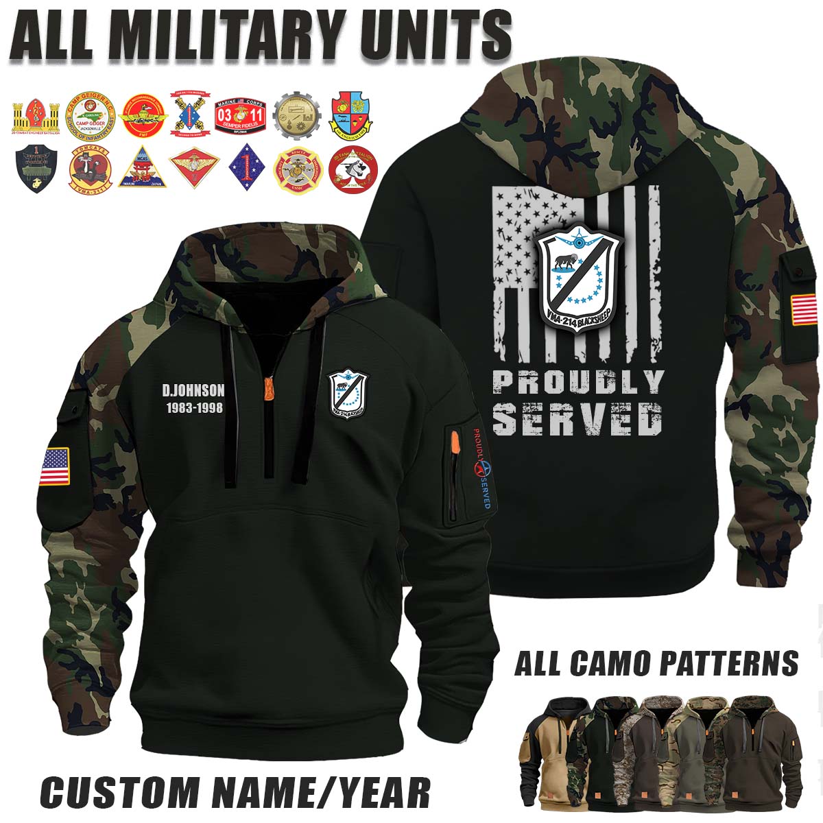This VMA-214 Blacksheep_Camo Halfzip Hoodie lets you customize your Branch, Unit, Role, Rank, and Years Served — so your service, sacrifice, and pride live on.