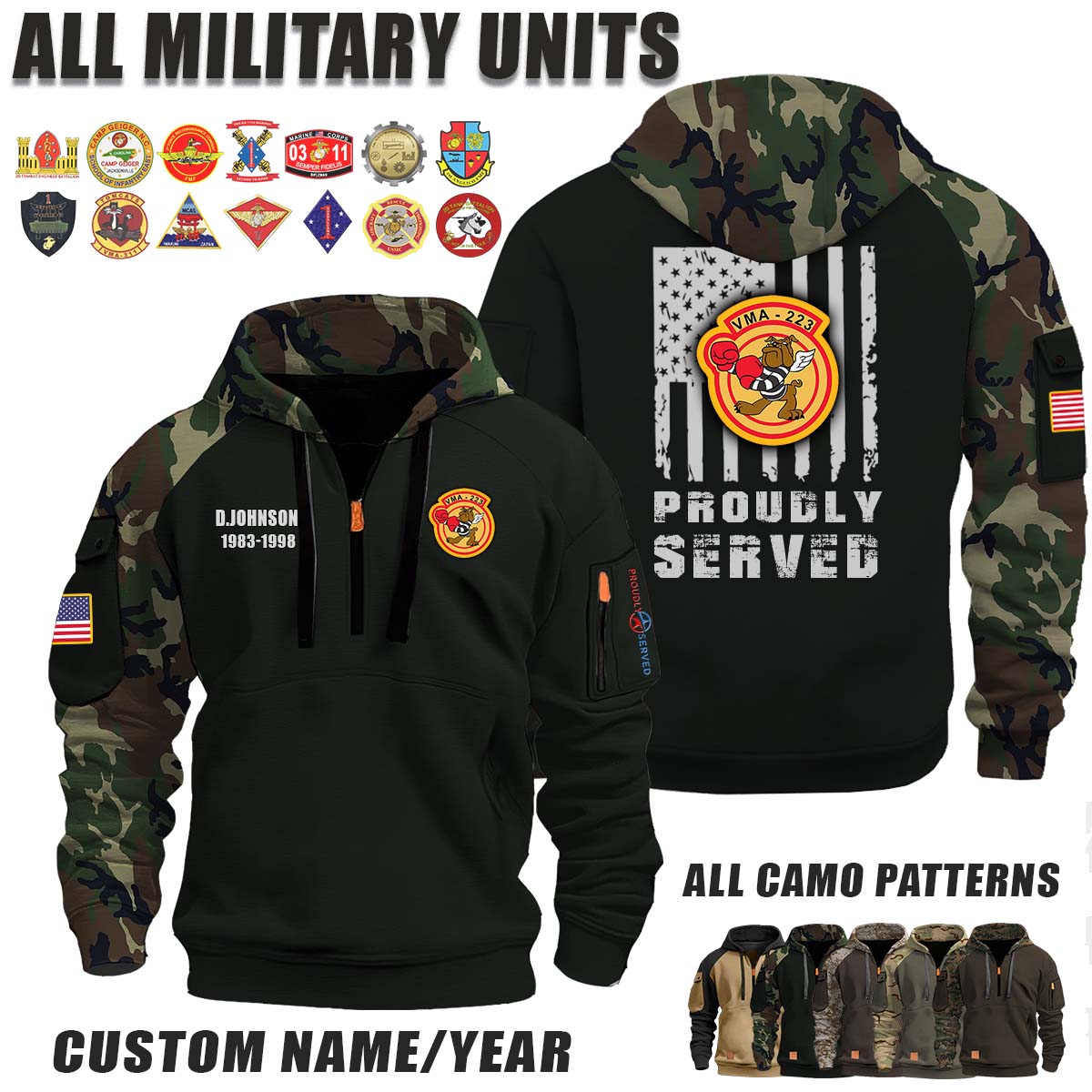 This VMA-223 Bulldogs_Camo Halfzip Hoodie lets you customize your Branch, Unit, Role, Rank, and Years Served — so your service, sacrifice, and pride live on.