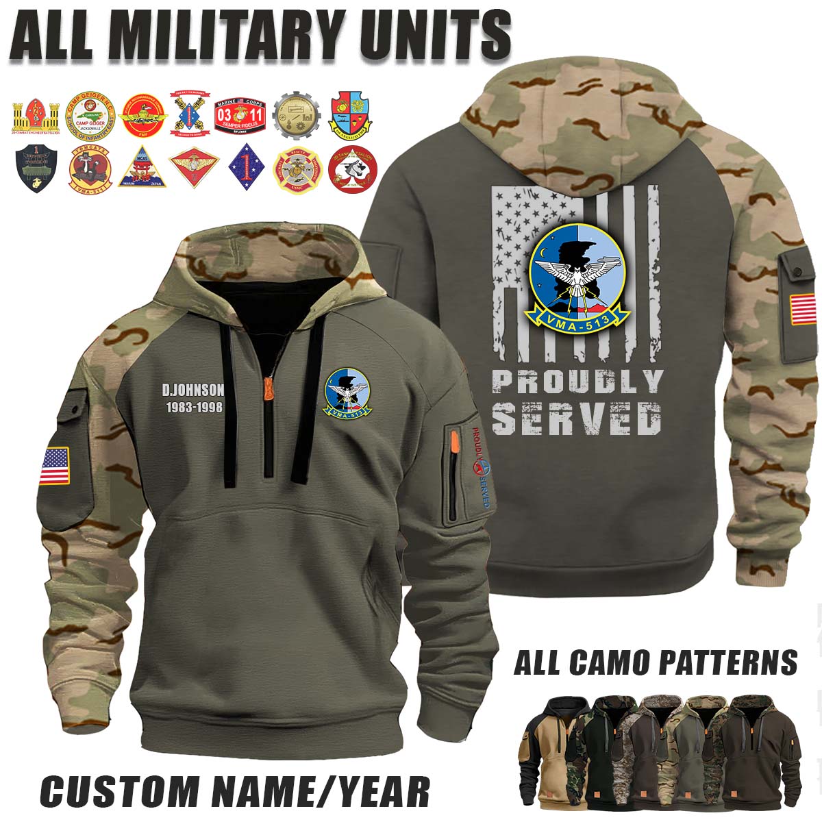 This VMA-513 Flying Nightmares_Camo Halfzip Hoodie lets you customize your Branch, Unit, Role, Rank, and Years Served — so your service, sacrifice, and pride live on.