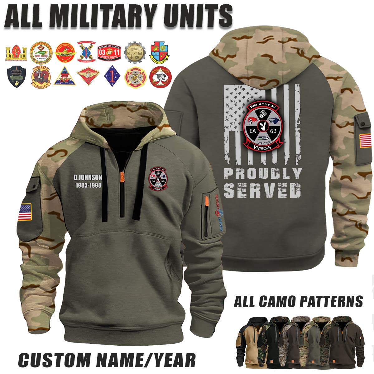 This VMAQ-5_Camo Halfzip Hoodie lets you customize your Branch, Unit, Role, Rank, and Years Served — so your service, sacrifice, and pride live on.
