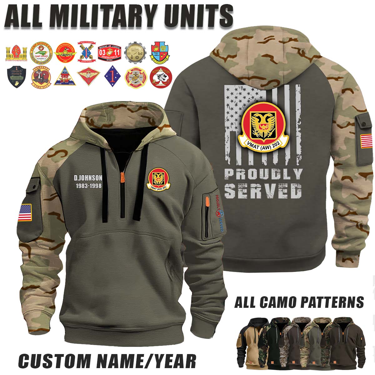 This VMAT(AW)-202_Camo Halfzip Hoodie lets you customize your Branch, Unit, Role, Rank, and Years Served — so your service, sacrifice, and pride live on.