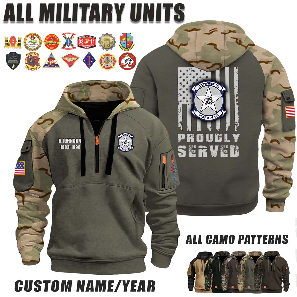 This VMFA-112 Cowboys_Camo Halfzip Hoodie lets you customize your Branch, Unit, Role, Rank, and Years Served — so your service, sacrifice, and pride live on.