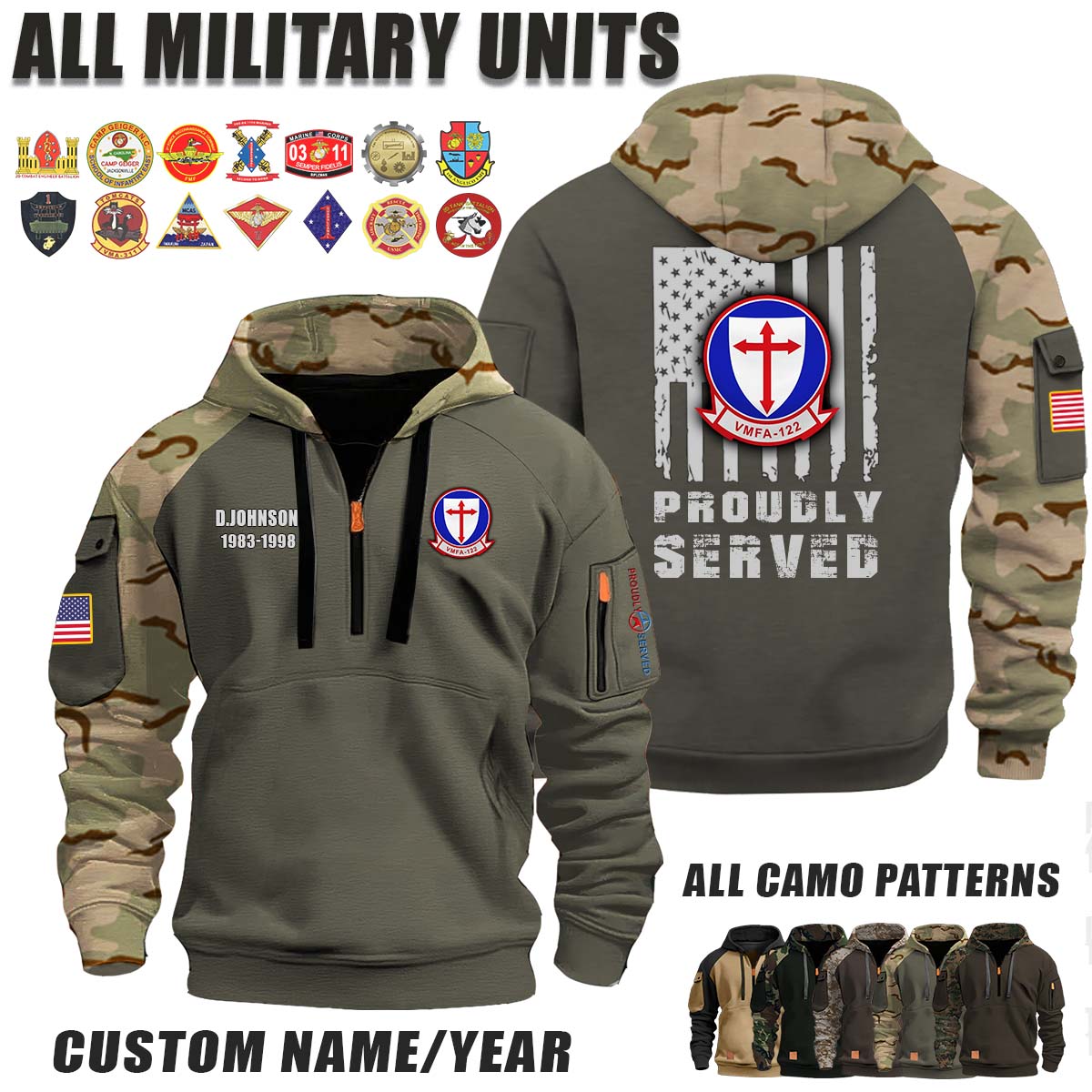 This VMFA-122 Crusaders_Camo Halfzip Hoodie lets you customize your Branch, Unit, Role, Rank, and Years Served — so your service, sacrifice, and pride live on.