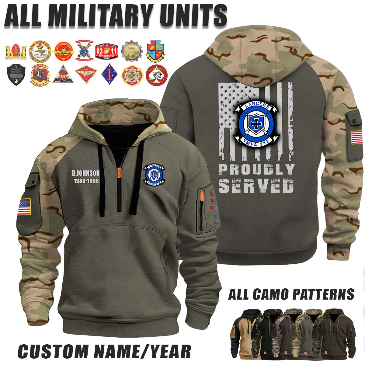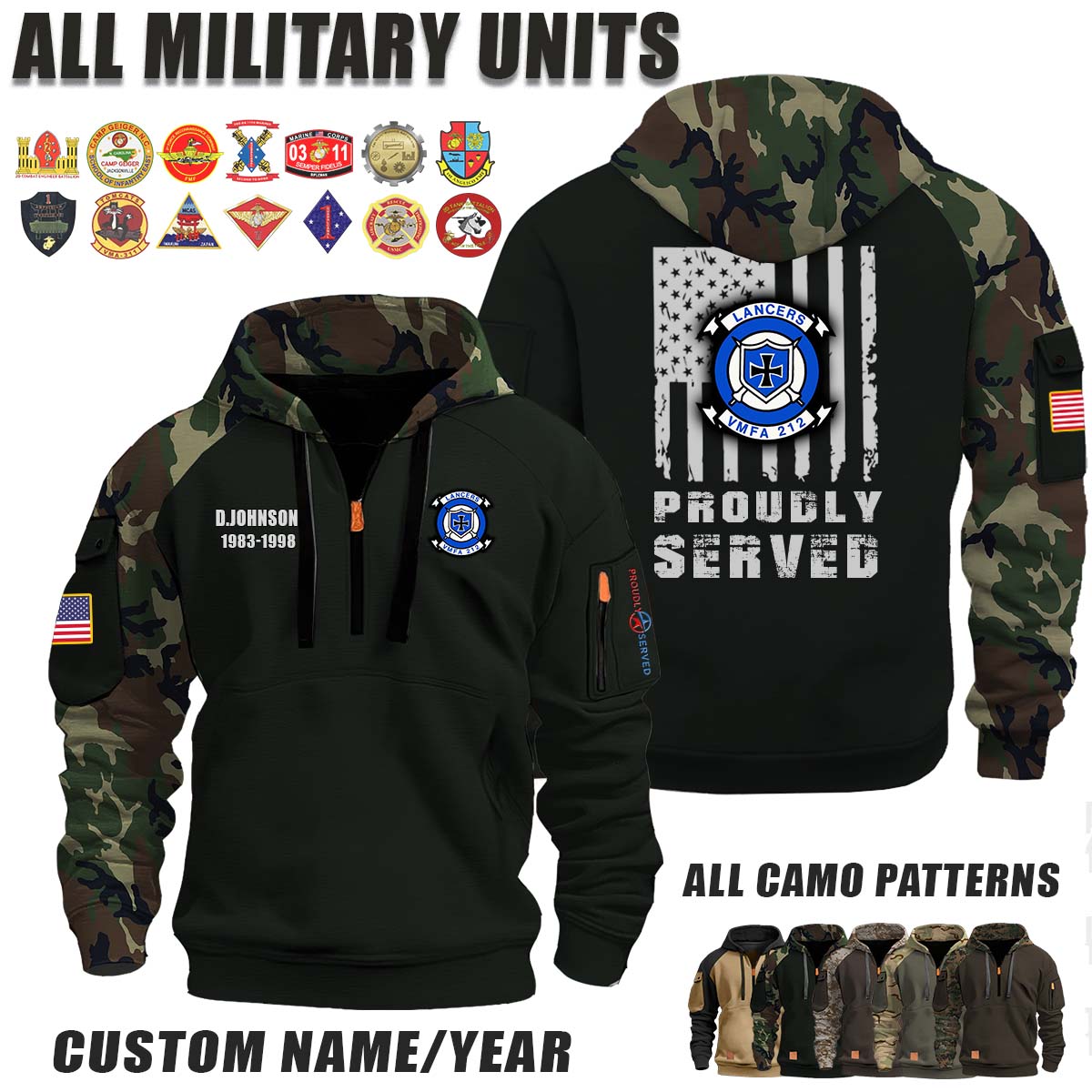 This VMFA-212 Lancers_Camo Halfzip Hoodie lets you customize your Branch, Unit, Role, Rank, and Years Served — so your service, sacrifice, and pride live on.