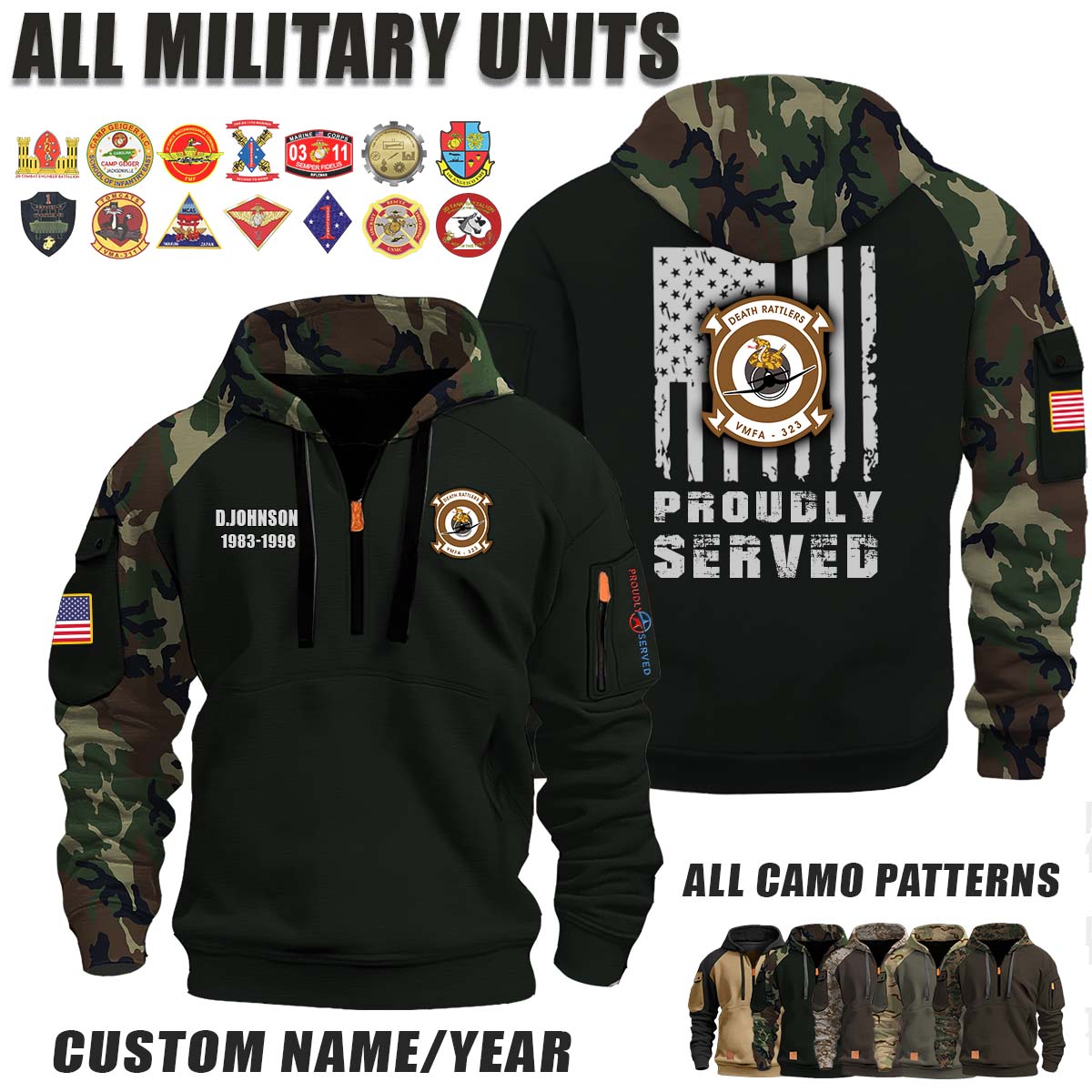 This VMFA-323 Death Rattlers_Camo Halfzip Hoodie lets you customize your Branch, Unit, Role, Rank, and Years Served — so your service, sacrifice, and pride live on.