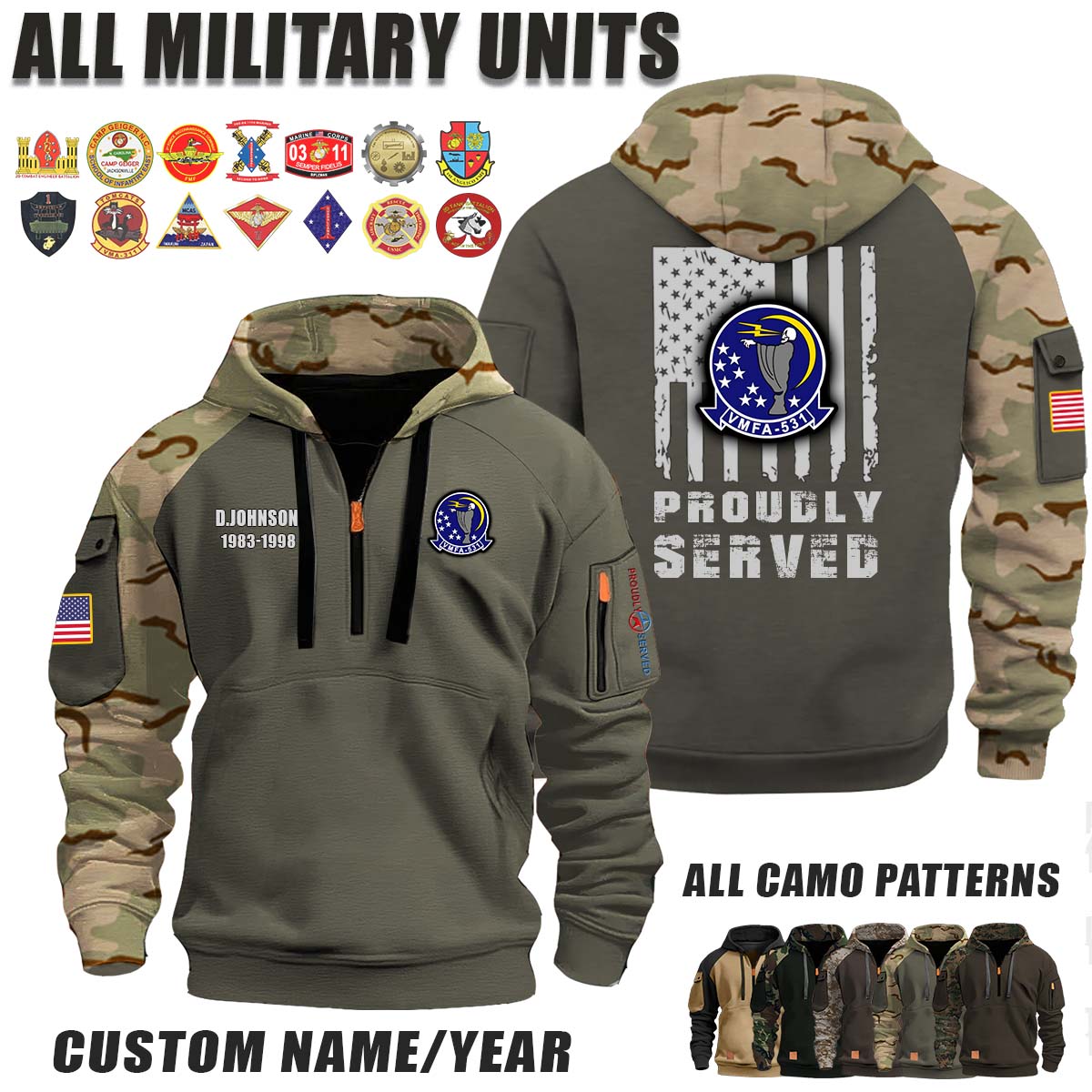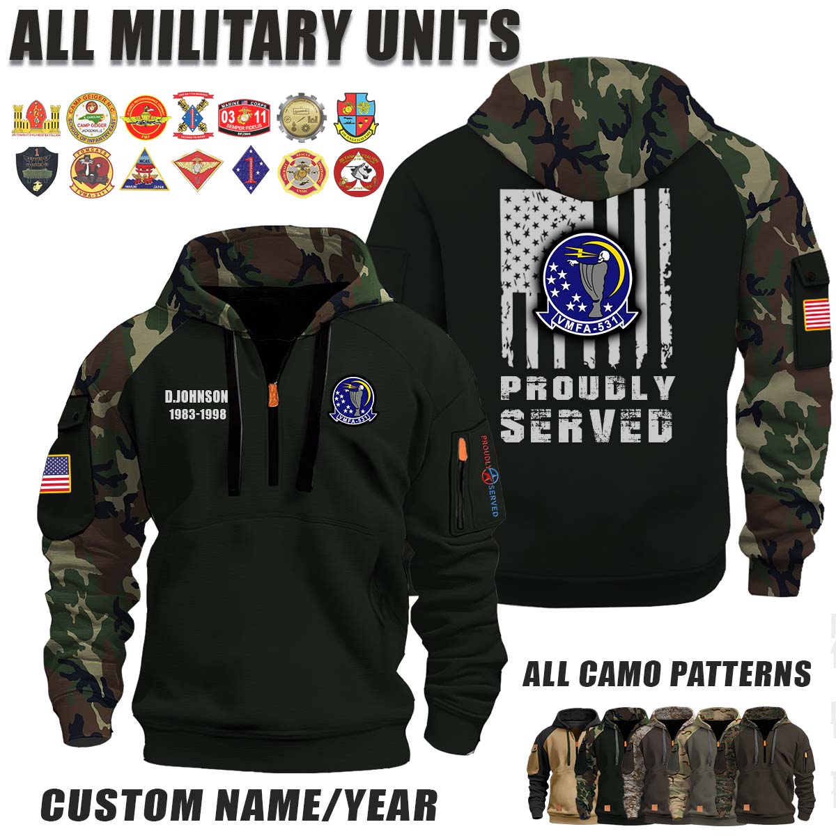 This VMFA-531 Grey Ghosts_Camo Halfzip Hoodie lets you customize your Branch, Unit, Role, Rank, and Years Served — so your service, sacrifice, and pride live on.